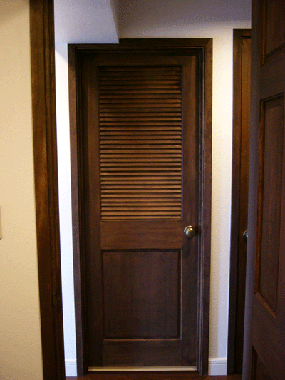 室内ドアは全て無垢の落とし込みで、リビングドアのガラスにはラチェットガラスを使用しています。洗面ドアはルーバー仕様です。